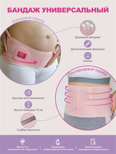 Бандаж универсальный для беременных, применяется в до- и послеродовом периоде. В дородовом периоде поддерживает комфортно животик, не скручивается, поддерживает позвоночник, снимает нагрузку, способствует правильному расположению плода. Бандаж предотвращает появление растяжек. В послеродовом периоде поддерживает животик и спину, снимает нагрузку с позвоночника, способствует быстрому восстановлению. Особенности бандажа:- Дышащий воздухопроницаемый материал с высоким содержанием хлопка- Анатомическая форма бандажа прилегает точно по фигуре, не перекручивается- Не заметен под одеждой- Удобная застежка velcro- Можно стирать. Перед применением обратитесь к инструкции. Товар является медицинским изделием, прошел лабораторные испытания и имеет сертификацию Росздравнадзора. Сделано в России.