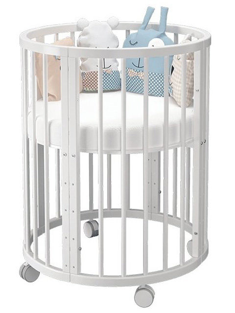 Круглая кроватка на колесиках с маятником может превратиться по мере роста малыша в овальную кроватку или манеж. Маятниковый механизм можно убрать или застопорить, чтобы кроватка не раскачивалась. Пока вы пользуетесь круглой кроваткой, центральную часть можно использовать как пеленальный столик.