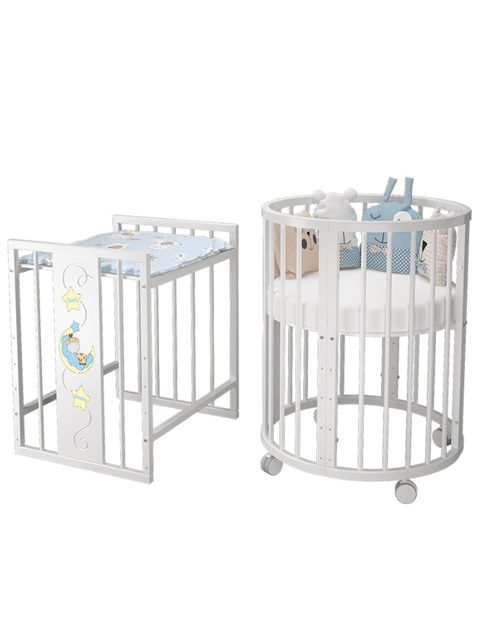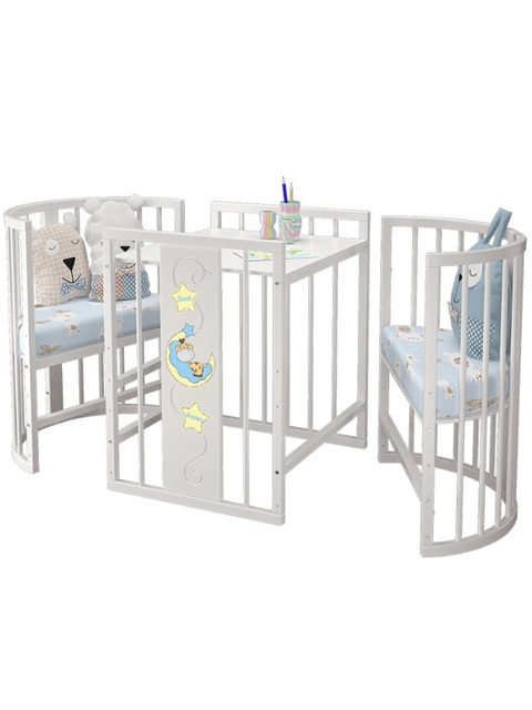 Кроватку-трансформер можно собрать как: круглую люльку, овальную кровать, манеж, стол со стульями, пеленальный стол.