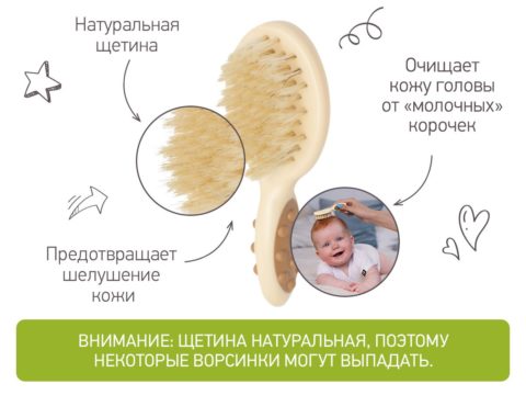 C помощью расчески с частыми, но не острыми зубчиками удобно расчесывать запутавшиеся и скатавшиеся волосы, а с помощью натуральной щетки можно пригладить их и придать аккуратный вид. Комплект расчесок подойдет для массажа кожи головы и вычесывания себорейных корочек (обычное явление у новорожденных).