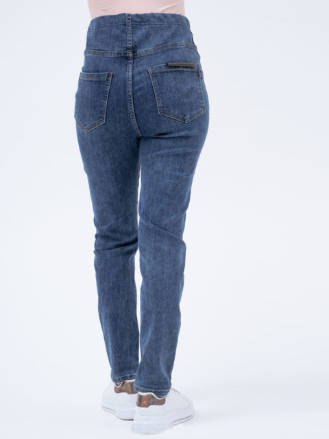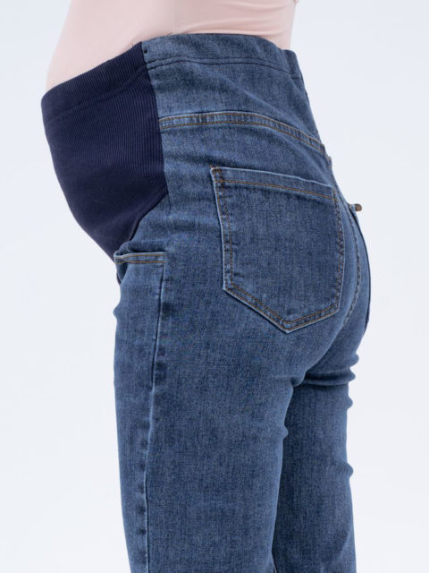 Джинсы для беременных с небольшой декоративной нашивкой на переднем кармане и слегка потёртым низом. Выполнены из плотной джинсы. Мягкие, хорошо тянутся. Высокий трикотажный бандаж по передней части регулируется пуговкой по верху.