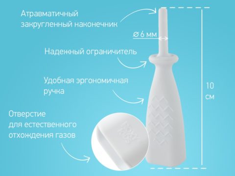 Трубка может использоваться в больницах или в домашних условиях. При использовании трубочки исключена возможность травмирования, потому что в конструкции предусмотрен ограничитель для безболезненного и безопасного проведения процедуры.