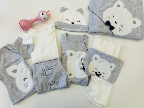 Классный комплект с богатым наполнением. Подойдет для летней выписки, а так же в качестве подарка на рождение малыша. Набор на выписку из 10ти предметов: Плед-полотенце с уголком 85×85 (хлопковый трикотаж, двойной-два стоя), кофточка на запах на кнопках, штанишки с закрытыми ножками, боди с коротким рукавом, жилетка на кнопках, распашонка, слюнявчик, шапочка, царапки, платочек.