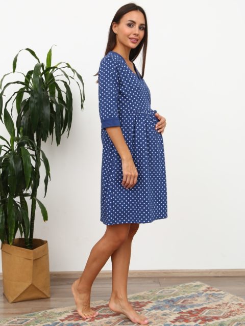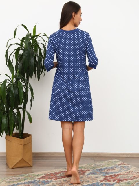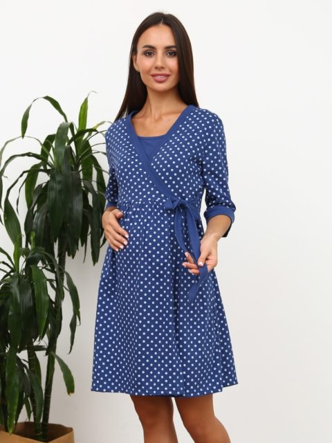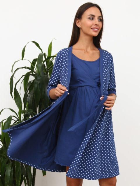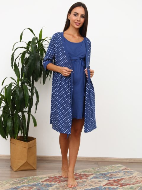 Комплект для роддома халат и сорочка для беременных и кормящих Горох/синий