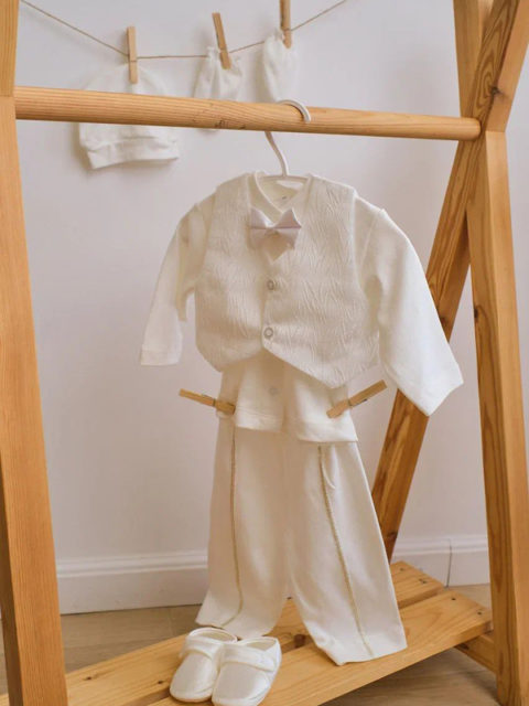 Набор для мальчика на выписку/крестильный/праздничный из 6ти предметов: кофточка, жилетка, штанишки, пинетки, царапки, шапочка.