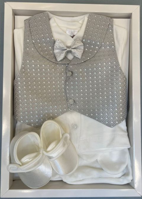 Набор для мальчика на выписку/крестильный/праздничный из 6ти предметов: кофточка, жилетка, штанишки, пинетки, царапки, шапочка.