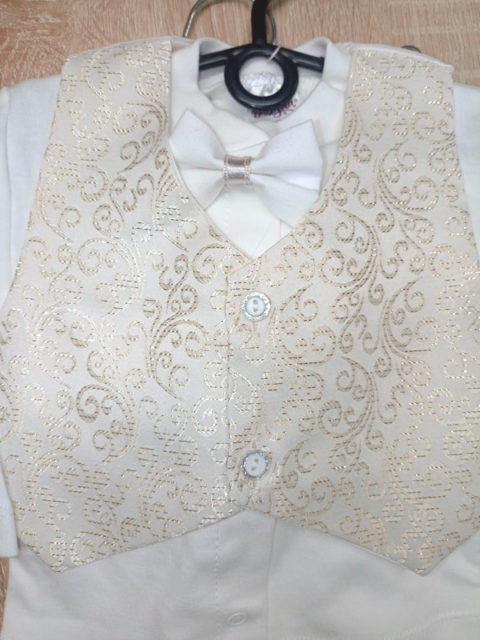 Набор для мальчика на выписку/крестильный/праздничный из 6ти предметов: кофточка, жилетка, штанишки, пинетки, царапки, шапочка.