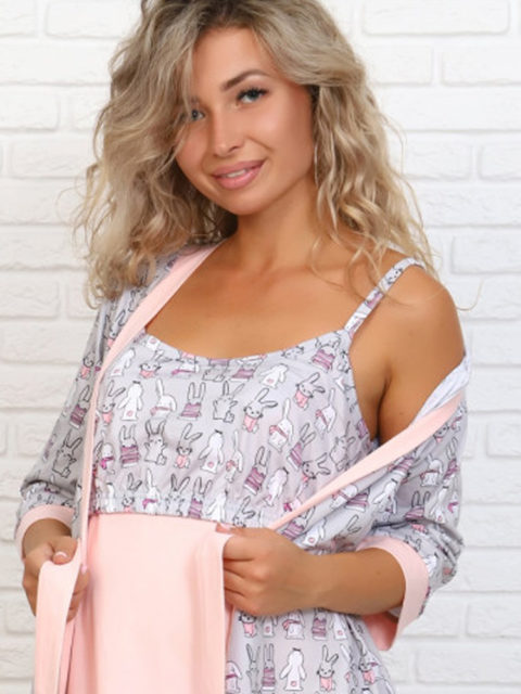 Комплект для роддома халат и сорочка для беременных кормящих Зайки, розовый