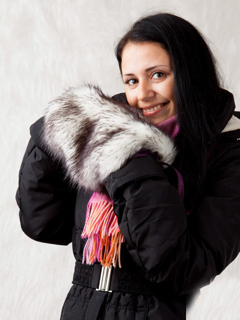 Мы используем искусственный мех для опушек капюшонов и муфт, т. к. любим животных и стараемся не удорожать изделие. Если пойдет дождь, то муфту можно вывернуть на другую сторону и она сохранит свой первозданный вид.