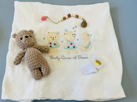 Набор на выписку/крестильный набор из 10ти предметов: Плед 85×85 см., Царапки, Штанишки с закрытыми ножками, Платочек, Майка, Шапочка, Кофточка на запах на кнопках, Распашонка, Слюнявчик, Боди с коротким рукавом.