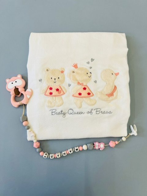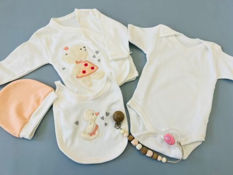 Набор на выписку/крестильный набор из 10ти предметов: Плед 85×85 см., Царапки, Штанишки с закрытыми ножками, Платочек, Майка, Шапочка, Кофточка на запах на кнопках, Распашонка, Слюнявчик, Боди с коротким рукавом.