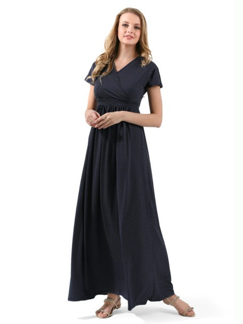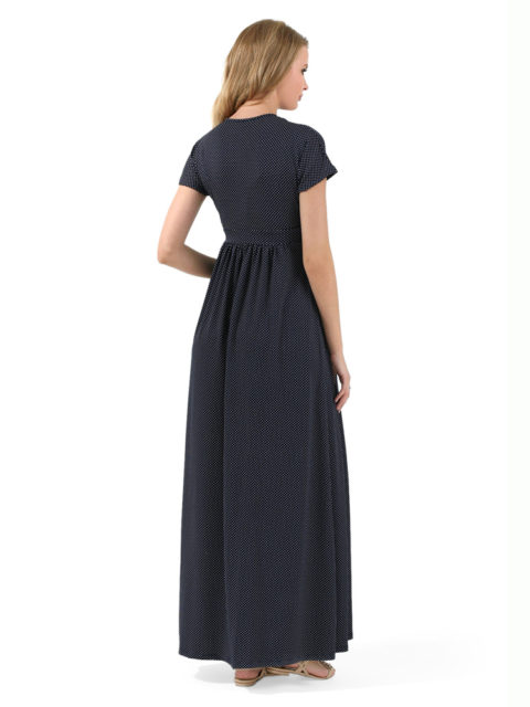 Модное платье макси-длины сшито из приятной к телу трикотажной ткани. Оно прекрасно подойдет для ношения в период беременности, имеет высокую кокетку, под которой легкие складки создают пространство для растущего животика. Модель имеет секрет кормления – запах на груди. Платье можно носить до начала и после окончания периода беременности и грудного вскармливания.