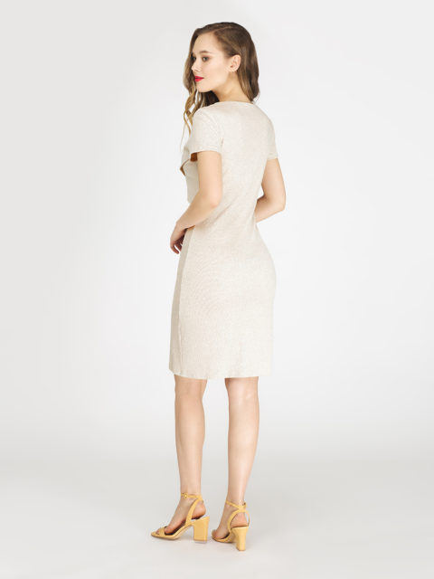 Платье приталенного силуэта сшито из хлопкового трикотажа “в рубчик”. Такая ткань хорошо тянется, за счет этого – подойдет на весь срок беременности.