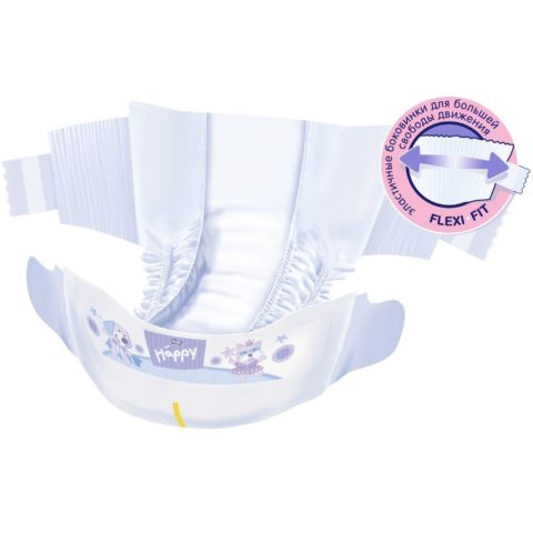 - Подгузники идеально прилегают к телу малыша благодаря широким эластичным боковинкам FLEXI FIT.