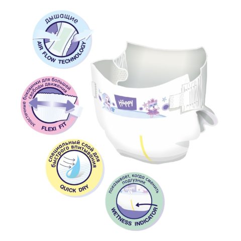 - Безопасность превыше всего – детские подгузники Happy дерматологически проверены, не содержат хлора и латекса!